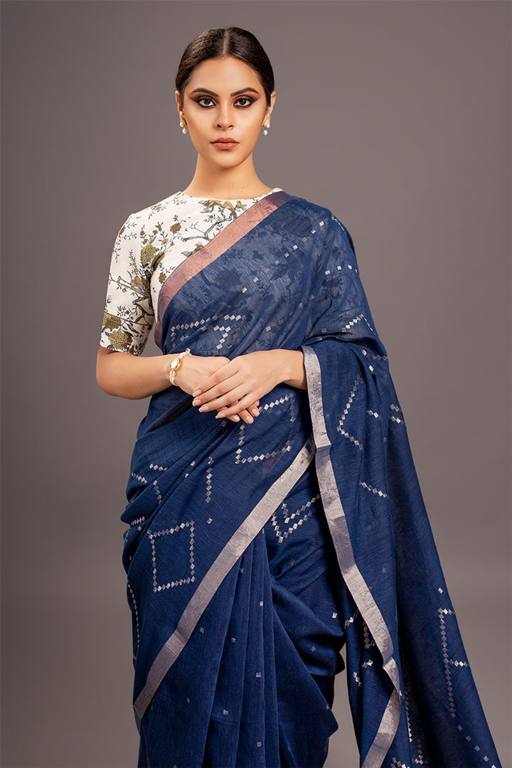 Indigo Zari Jamdani Pure Tussar Khadi Handloom Sari