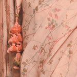 This perfect pale peach printed linen sari has a contemporary look with small bunches of magnolia flowers in teal blue and golden brown shades scattered all over announcing the commencement of spring.