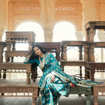 The ancestral flower motifs have been handcrafted to perfection by our artisans with the scrupulous method of Minakari. The Zari threads used in the creation of the motifs glow up because of the alluring teal shade, making this sari your perfect partner for any traditional event. Well illustrated artistic Jaal work crafted onto the drape, undoubtedly make this sari an indigenous masterpiece. The grandiose of this Firozi colored heirloom has a special place in our hearts.