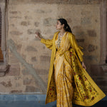 Classic Pitambari colored Benarasi sari that is hand-crafted using the Kadhua technique. The gorgeous floral Jangla glorifies the base color making this drape a perfect addition to your wedding outfits' list! Despite being a Jaaldar sari, it's lightweight because our artisans have designed it using the ektara weave. The creative Minakari work includes plum-colored miniature flowers with a pink base. You can definitely pair our customized plum blouse with this stunning sari.