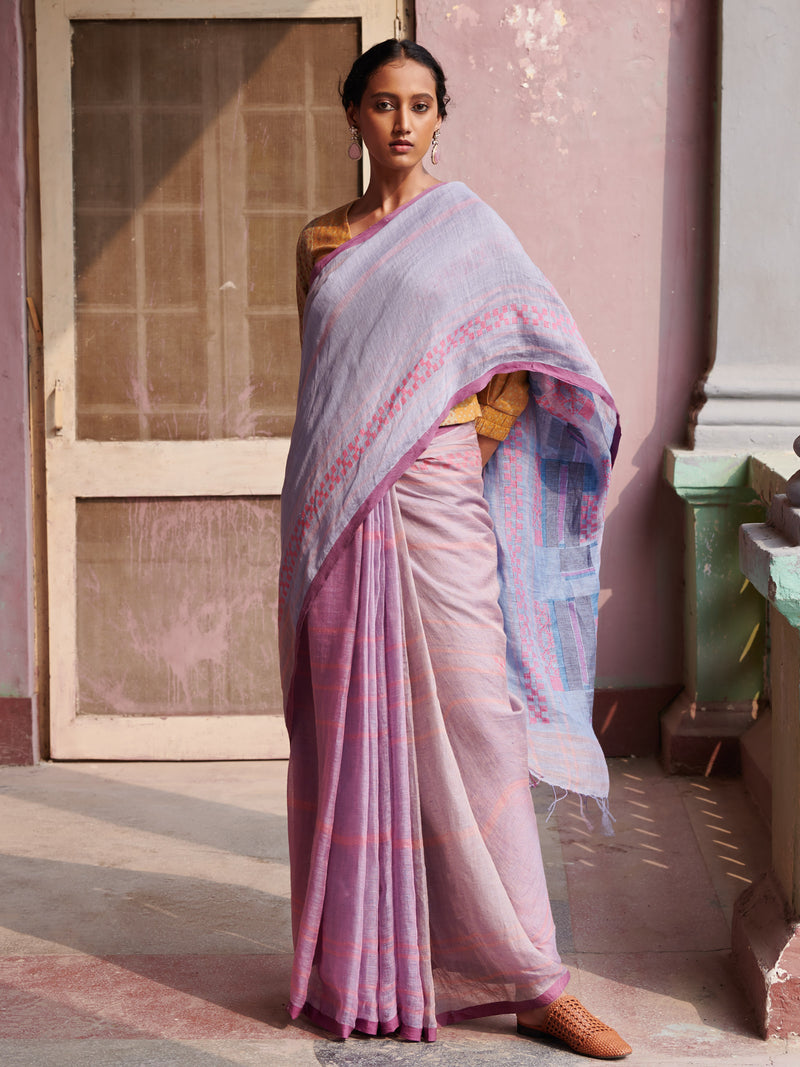 A pale blue innocence of youth hangs over this geometric linen sari, reminiscing over a longing that would consume you. Bringing to you this blooming linen sari from our Kadambari Collection to remind you of lovely bright mornings, mixed with the melody of birds.