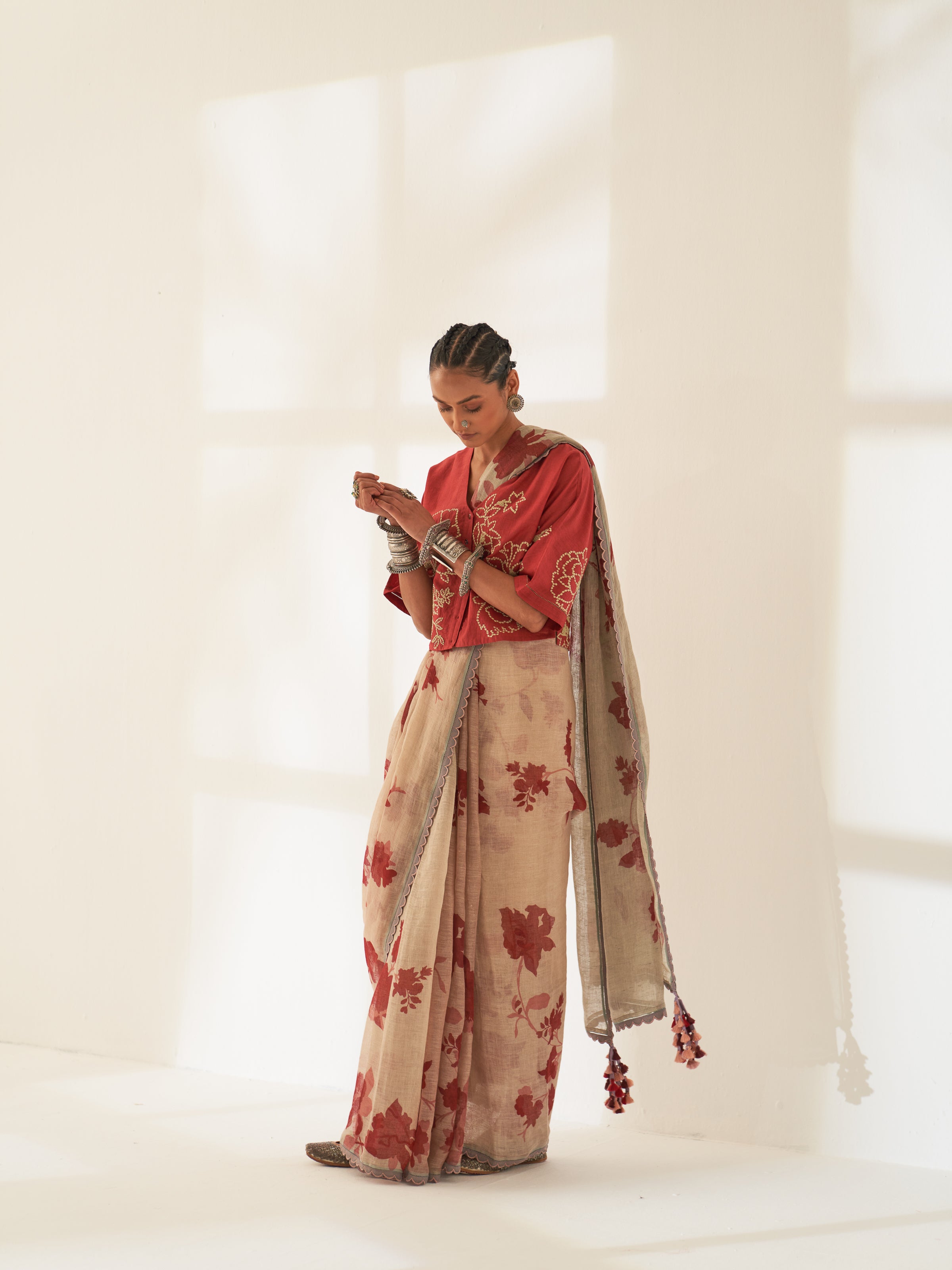 This season, Kasturi Woman focuses on minimalism. We celebrate saris that embody minimalism in a social setting- be it a cocktail or a day party. Linen Saris has evolved into a fashion statement, combining comfort, functionality, and style. Carefully designed floral print on 100-count handcrafted linen helps bring about an aura of effortless elegance about our Kasturi Woman. Cast aside the rules and make a statement with these stunning linen saris and embroidered blouses.