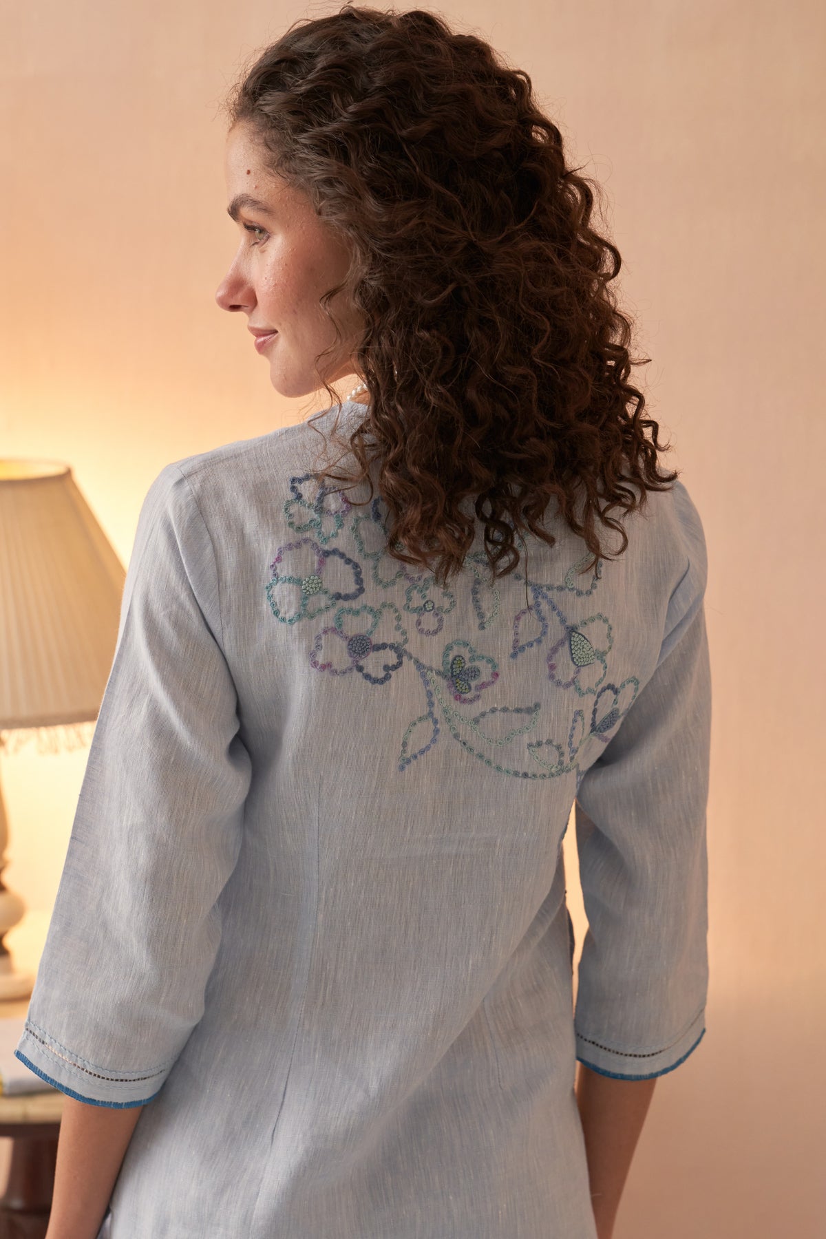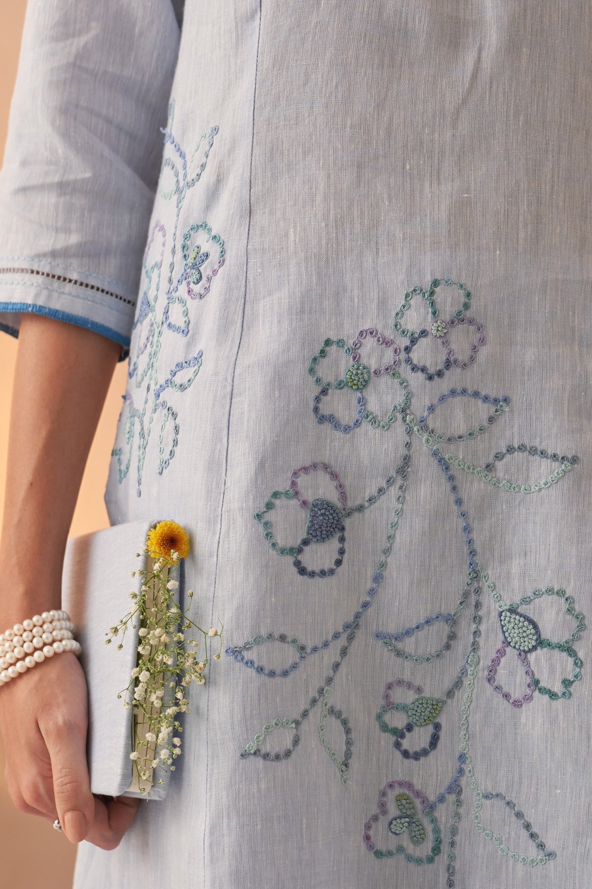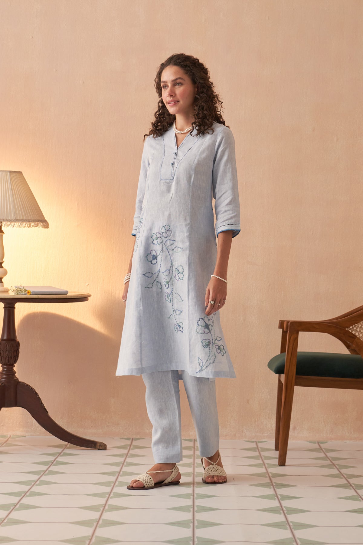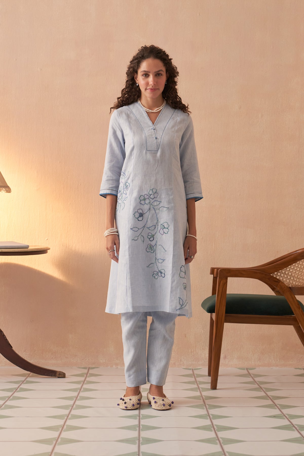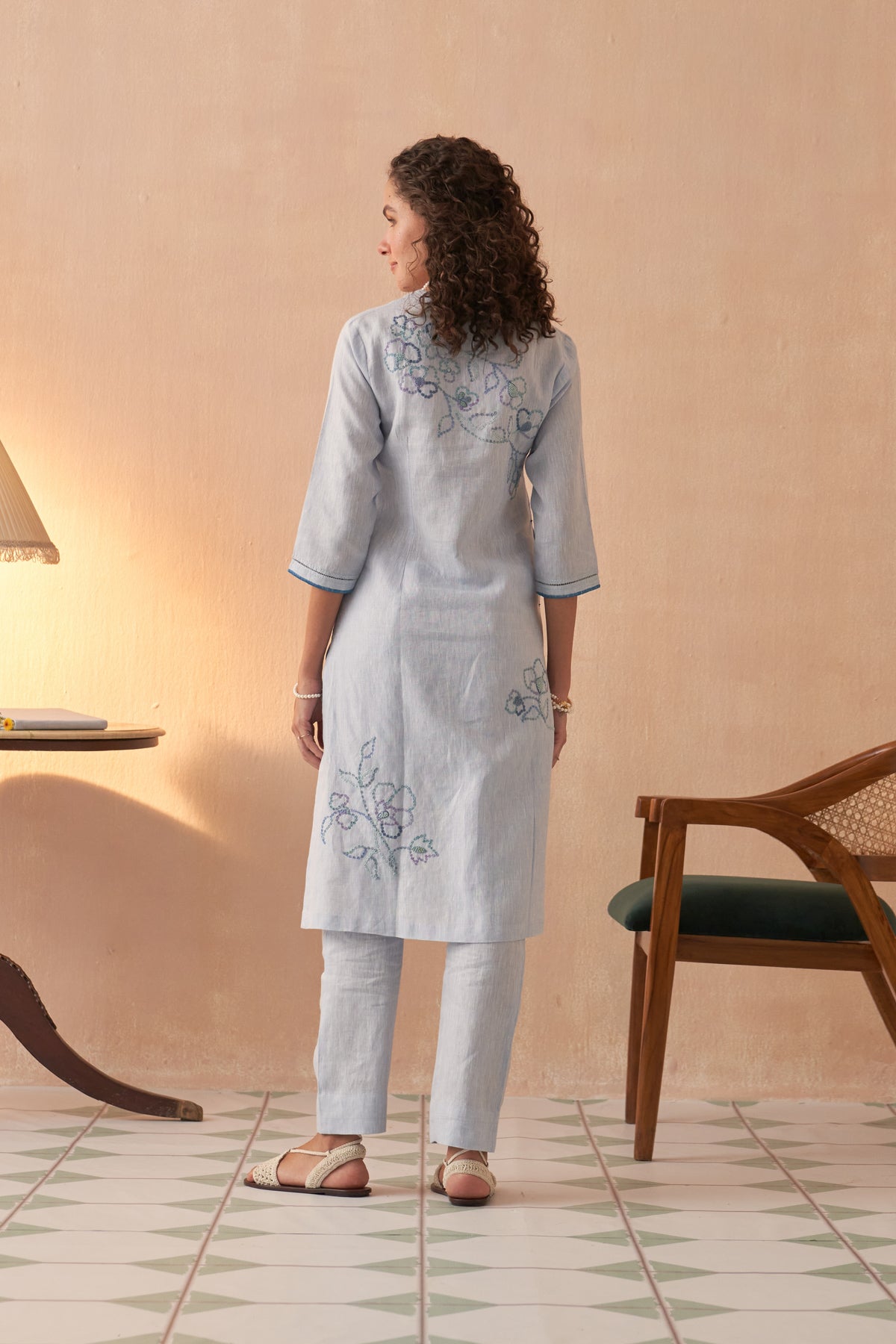 Perfect for year-round wear, ‘Intezaar’ is designed to offer a smart and flattering fit with a modern silhouette. The kurta features convenient pockets and is paired with straight pants to ensure a streamlined look. The powder blue hue symbolises the calm and serene touch of the finest linen, embroidered with delicate shaded floral details that enhance its unparalleled elegance, much like the gentle glow of the moon.