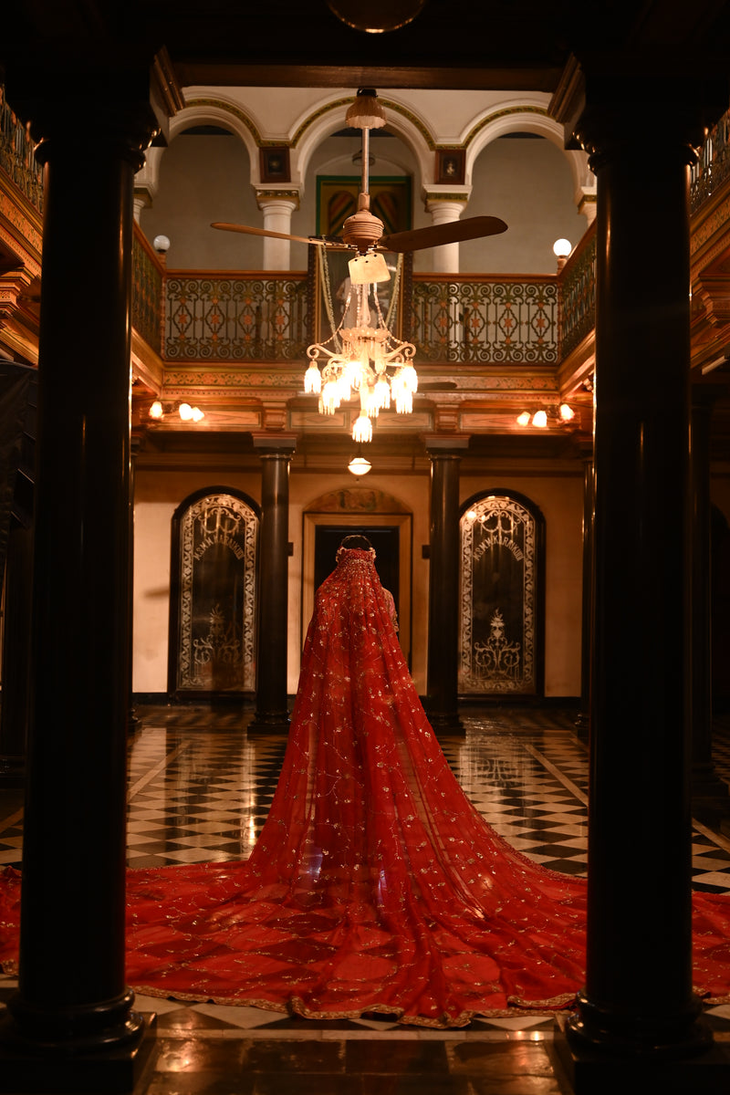 The magnanimous trail of the deep red Chunarr veil descends down for 11ft with its body featuring Dabka with work all along and intricately handcrafted borders.