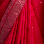 The striking beauty of this Fuschia Jamdani Tussar Sari will surely be a head-turner in every event. Stand out with a perfect drape adorned with silver Zari butti and Zari border.