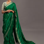 The striking beauty of this forest green Jamdani Tussar Sari will surely be a head-turner in every event. Stand out with a perfect drape adorned with silver Zari flower butta and copper Zari border.