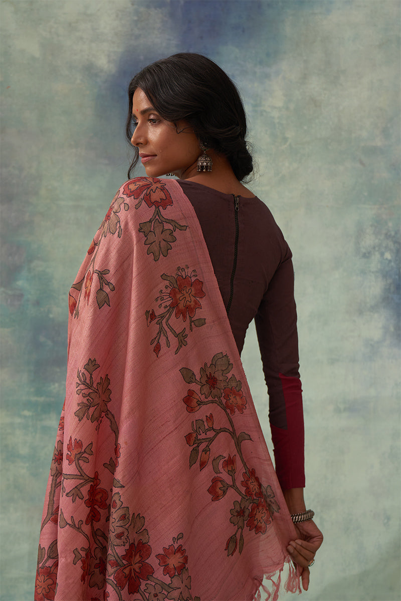 So pure & innocent in its simplicity that this charming drape instantly wins hearts. To achieve such sophistication this pure Tussar Kalamkari saree was woven and paired with hand-painted Hibiscus Buttas on solid pink for an added elegance.