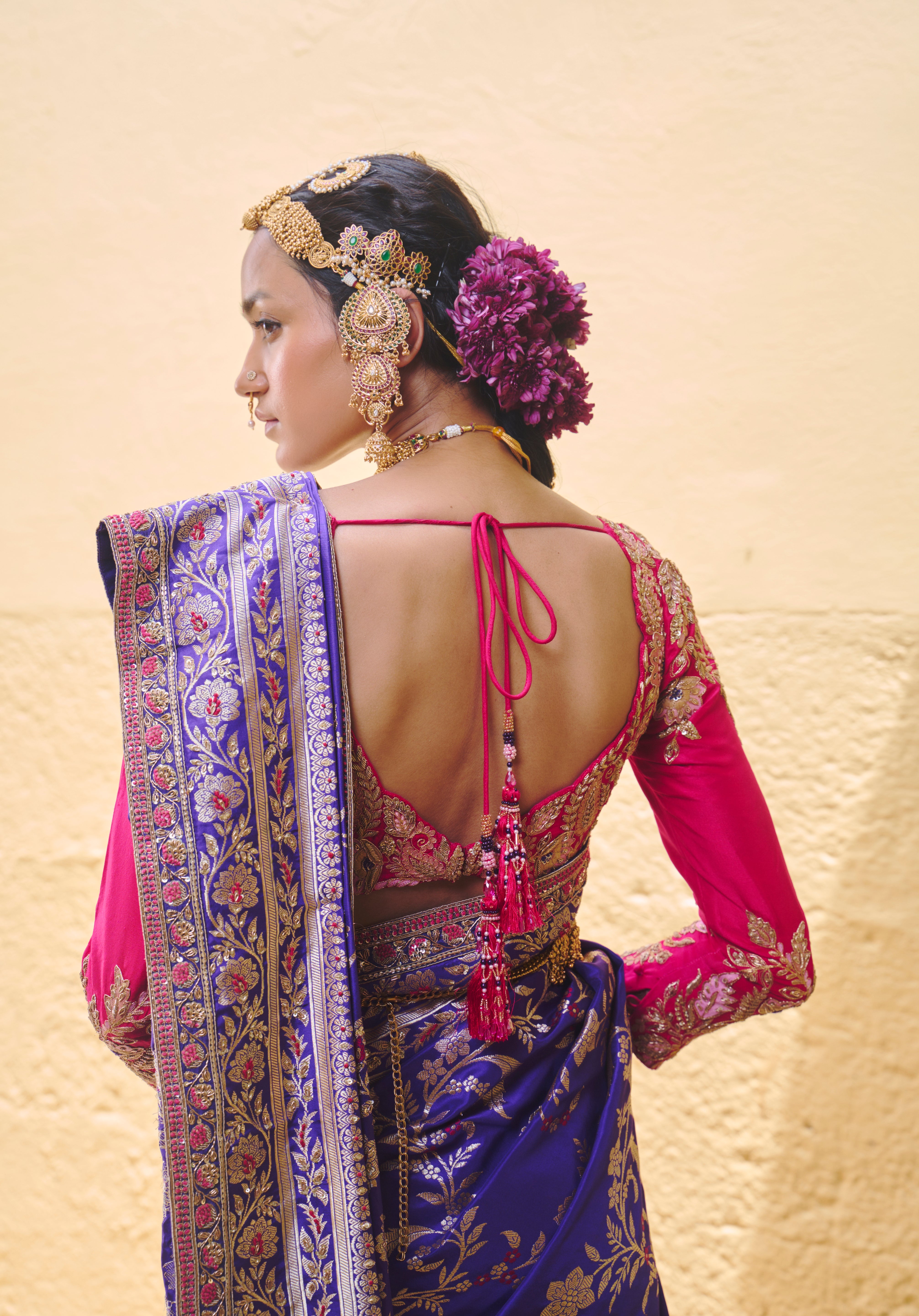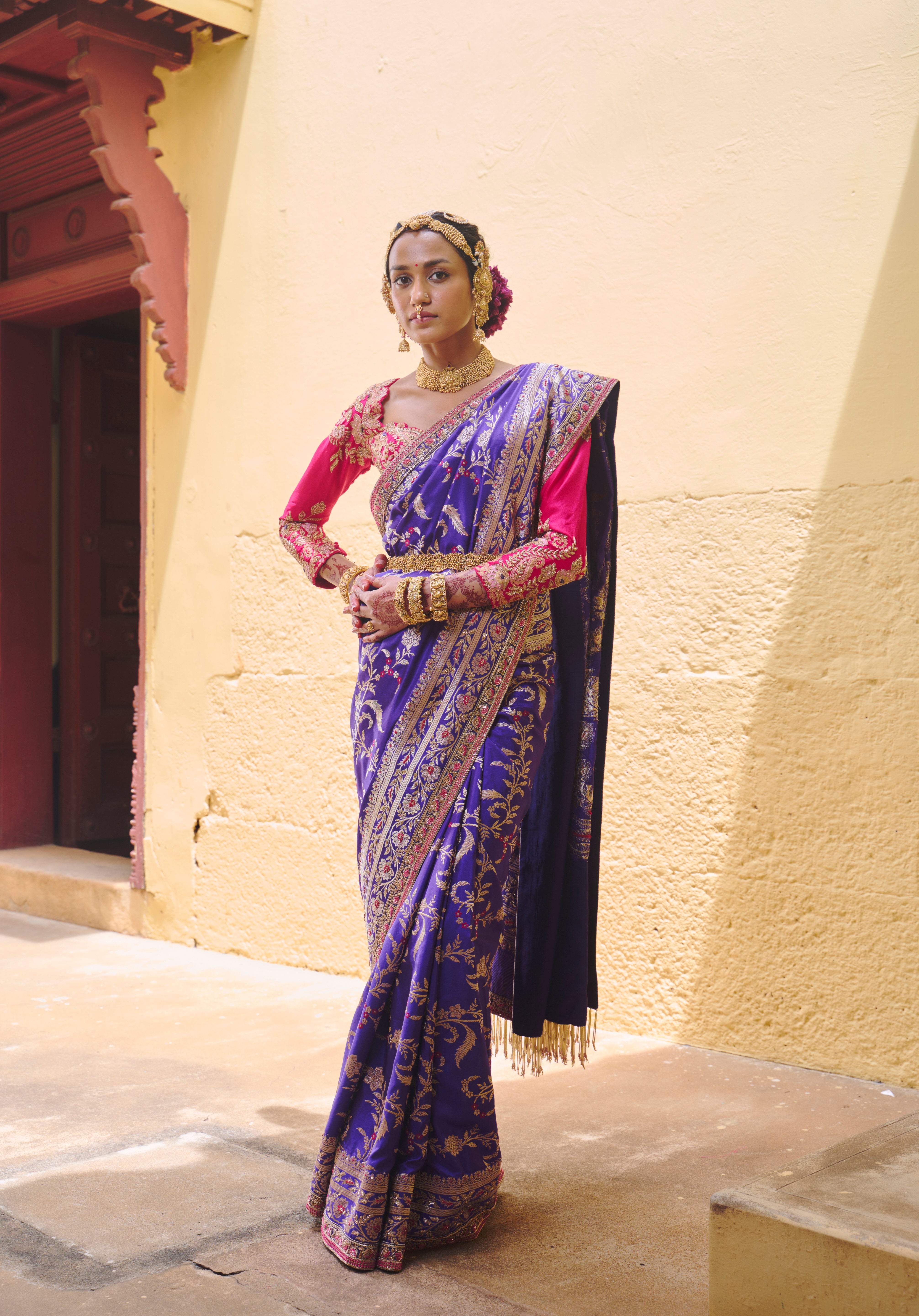 A violet Banarasi silk saree in pure Kataan silk in warp and weft with Zardozi Dabka work featuring Jangla, Meenakari and Kadhua weave.