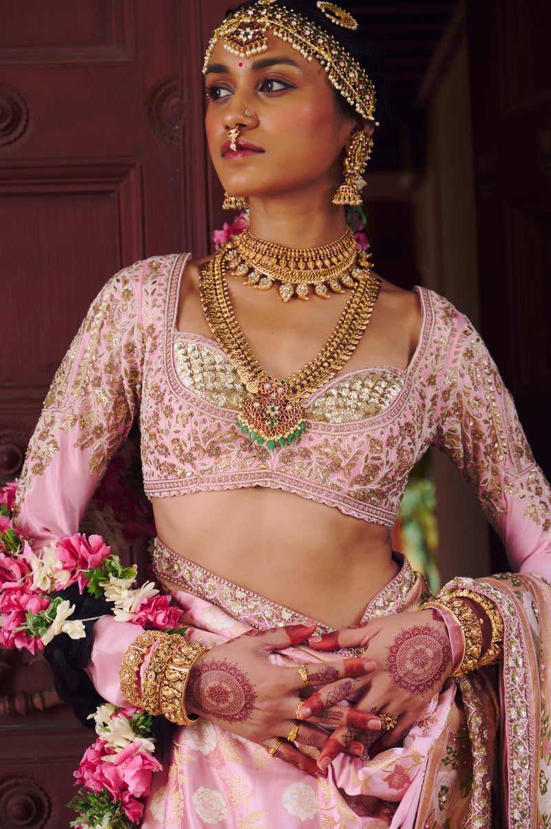 A soft pink Kataan silk blouse featuring Aari Zardozi work with pearls.