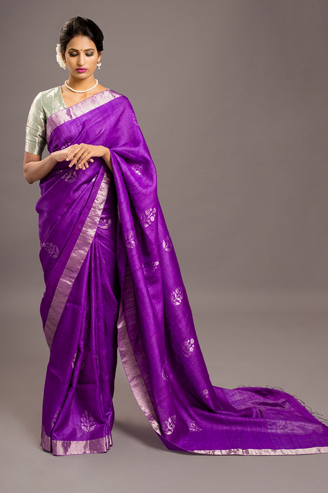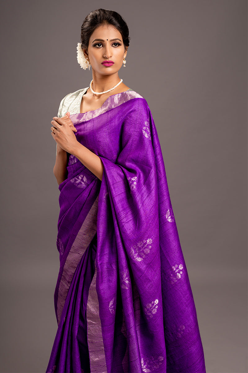 Verbena Purple Jamdani Pure Tussar Handloom Silk Sari