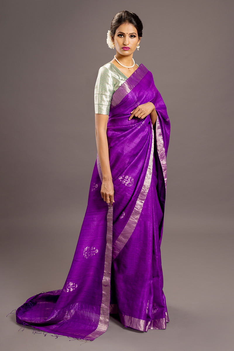 The striking beauty of this verbena purple Jamdani Tussar Sari will surely be a head-turner in every event. Stand out with a perfect drape adorned with distinctive silver Zari flower butta and solid copper Zari border.