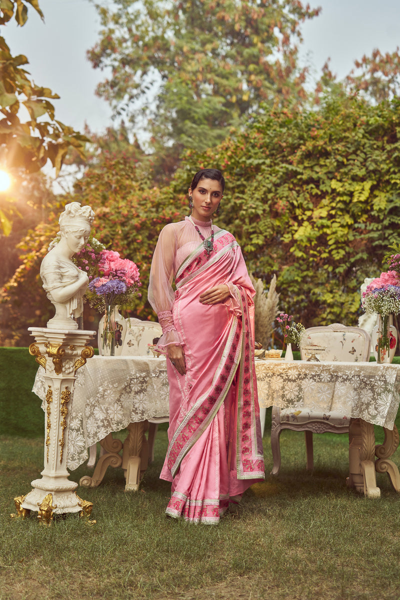 A canvas of a luxurious symphony of tradition and modern aesthetics. The saree boasts the intricate Minakari and Kadhua techniques, culminating in a delicate Organza border on a carnation pink base adorned with a border that gracefully transitions from soft hues, completed with shaded roses that serve as a poetic tribute to timeless beauty. “Lady Chatterley” exudes a poised allure, reminiscent of a serene garden bathed in moonlight. The name itself draws inspiration from the classic novel, symbolising a blend of sensuality and refined charm. Embody the essence of a classic love story with each fold, every thread, weaved in a tale of beauty and nobility.