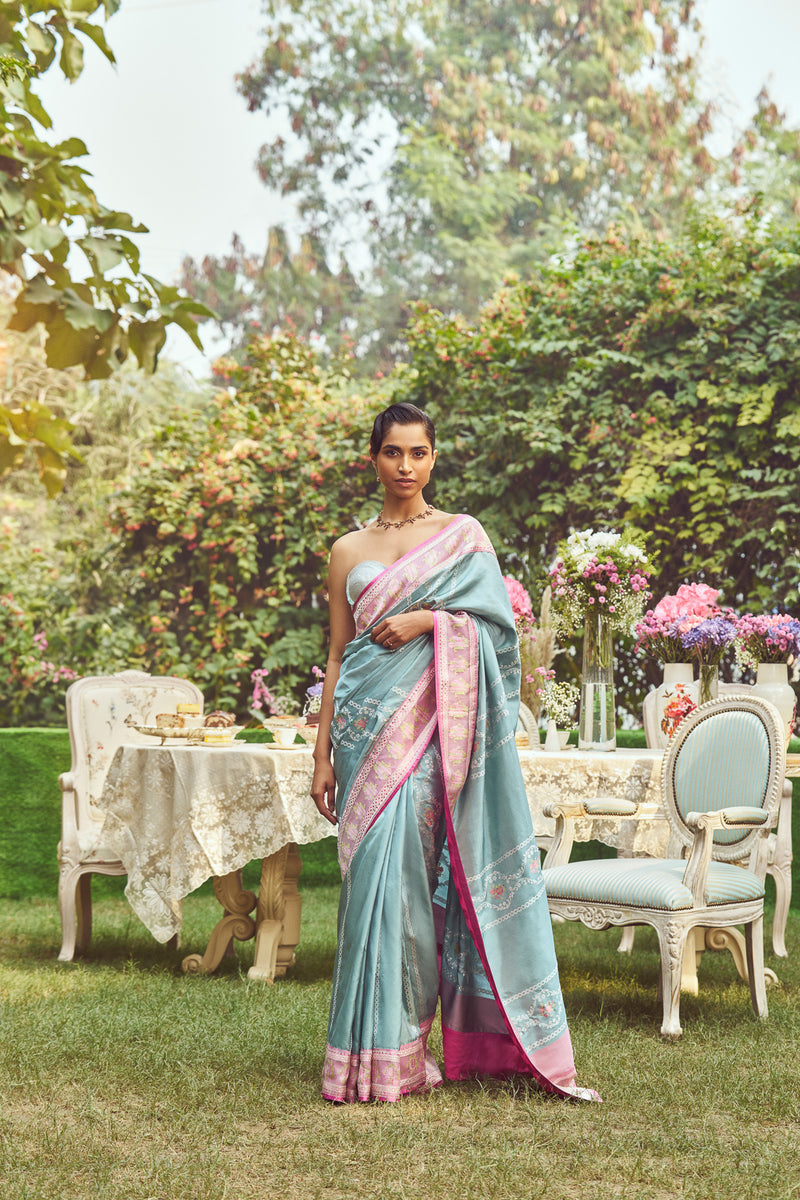 A canvas of a luxurious symphony of tradition and modern aesthetics. The saree boasts the intricate Minakari and Kadhua techniques, culminating in a delicate Organza border on a Wedgewood Blue base adorned with a border that gracefully transitions from soft hues, completed with shaded roses that serve as a poetic tribute to timeless beauty.