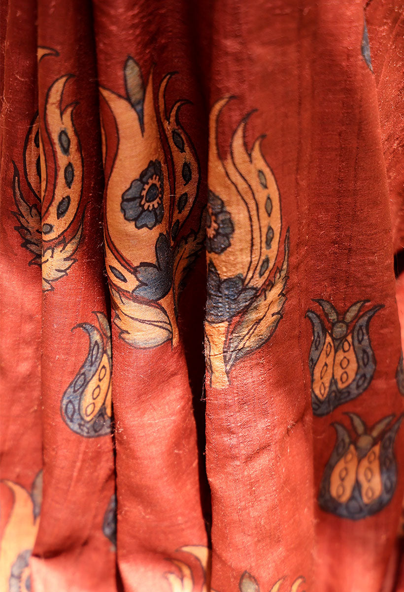 Craft: The process of making Kalamkari, dating back to more than 3000 B.C., involves 23 steps. This ancient temple art of hand-painting is done on a fabric with a tamarind pen, using natural dyes. Artisans extract black color by blending jaggery, water, and iron fillings which essentially is for outlining the sketches. While mustard or yellow is derived by boiling pomegranate peels, red hues are created from the bark of madder or algirin. Likewise, blue is obtained from indigo, and green is derived by mixing yellow and blue together.
