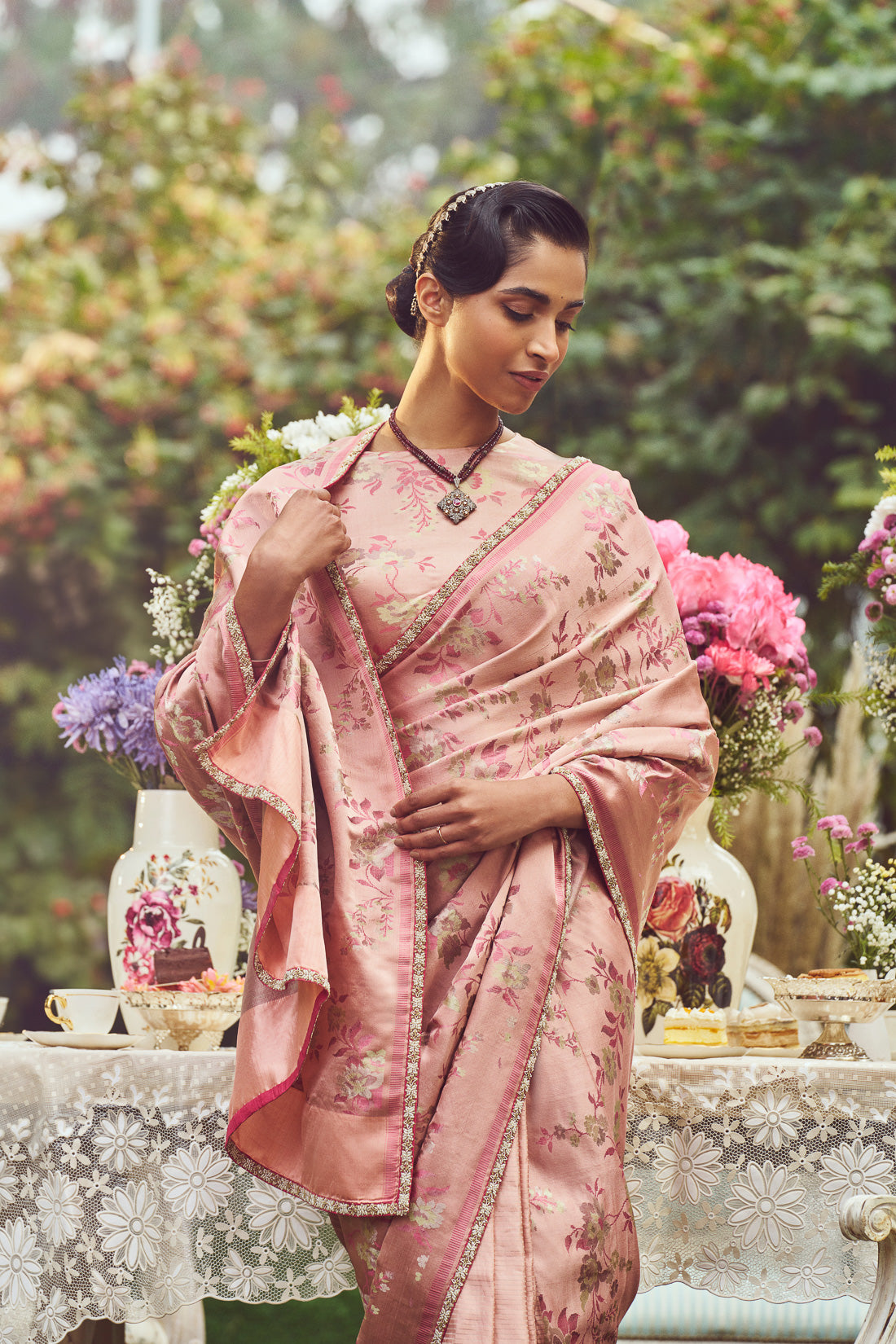 This Sari signifies its association with a classic literary character, symbolising a fusion of passion, sophistication, and a desire for the extraordinary. This sari boasts the artistry of Jaal, Minakari, and Tanchoi, creating a seamless blend of patrimony and modern flair. This sari is a true marvel of the Half & Half sari that is a canvas of versatility, offering two distinct looks. One side features delicate floral jaal, while the other is adorned with elegant Zari lines. The Aanchal presents a choice between lines or a burst of blossoms, providing the wearer the power to transform her appearance with a simple twist. Adding a touch of luxury, the Pearl embroidery on the border frames the saree with a subtle shimmer. The same delicate floral pattern graces the blouse, creating a cohesive ensemble.