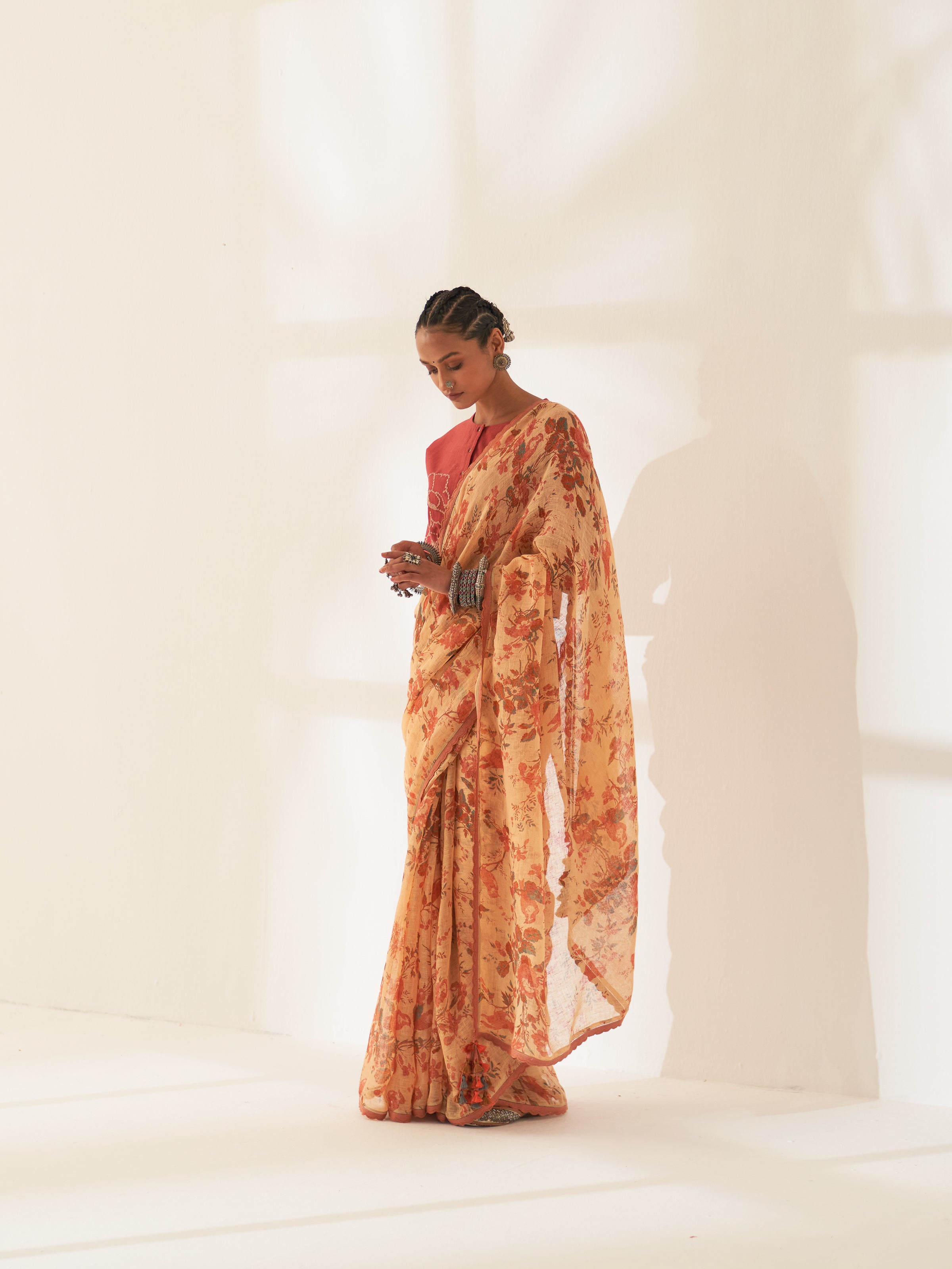This season, Kasturi Woman focuses on minimalism. We celebrate saris that embody minimalism in a social setting- be it a cocktail or a day party. Linen Saris has evolved into a fashion statement, combining comfort, functionality, and style. Carefully designed floral print on 100-count handcrafted linen helps bring about an aura of effortless elegance about our Kasturi Woman. Cast aside the rules and make a statement with these stunning linen saris and embroidered blouses.