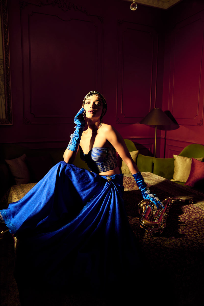 Embrace the fusion of classic craftsmanship and 90s-inspired jazz modernity with the Jaane Jaan from Monica, a piece that exudes effortless elegance and versatility, perfect for cocktails and parties. This electric blue handloom masterpiece, crafted using the traditional Tanchoi technique, embodies a harmonious blend of regality and modernity. Intricate geometric patterns dance across the fabric, infusing a modern flair into traditional Banarasi artistry.