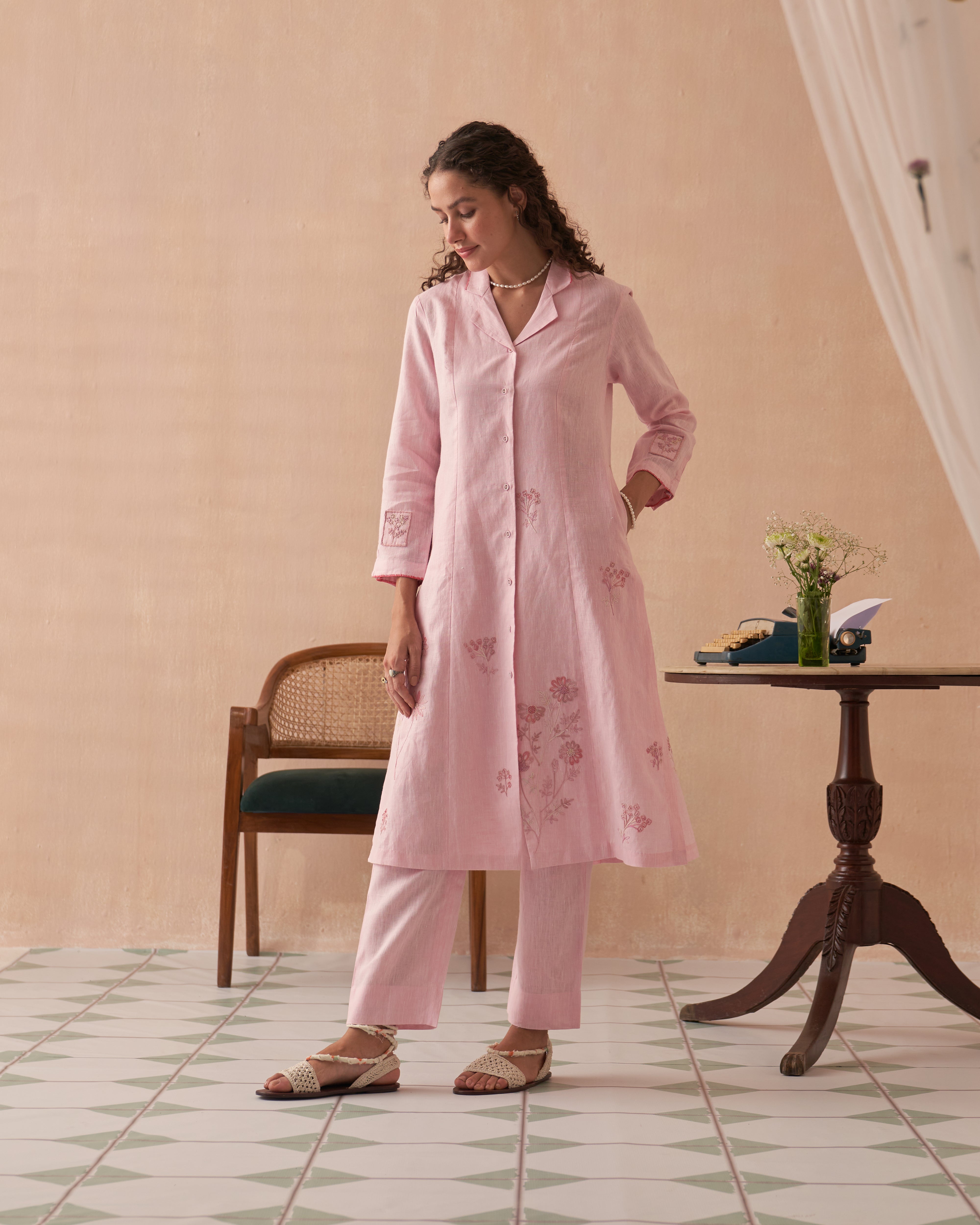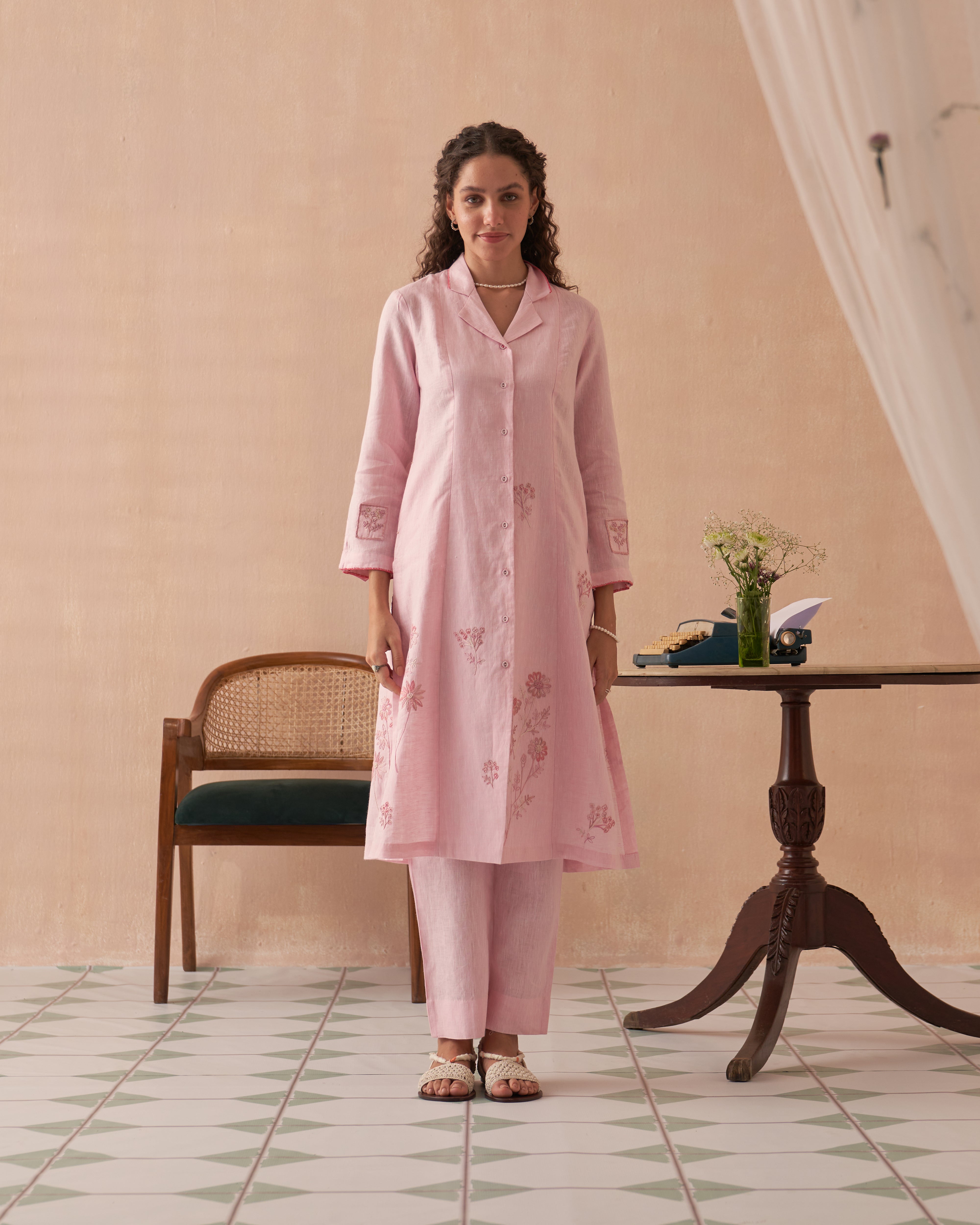 Crafted for comfort, ‘Ishq’ is designed to be your companion through all seasons. Featuring a smart fit with a button-down front attached to a collar neck and conveniently placed pockets, it adds a touch of modernity to your look. The powder pink hue and shaded floral embroidery whisper tales of romance, perfect for a sunny afternoon or a festive gathering under the twinkling moon.