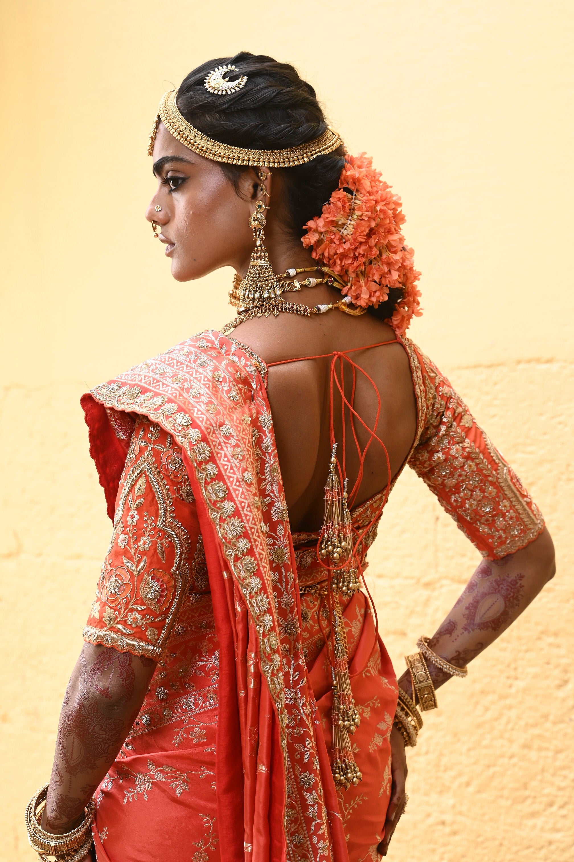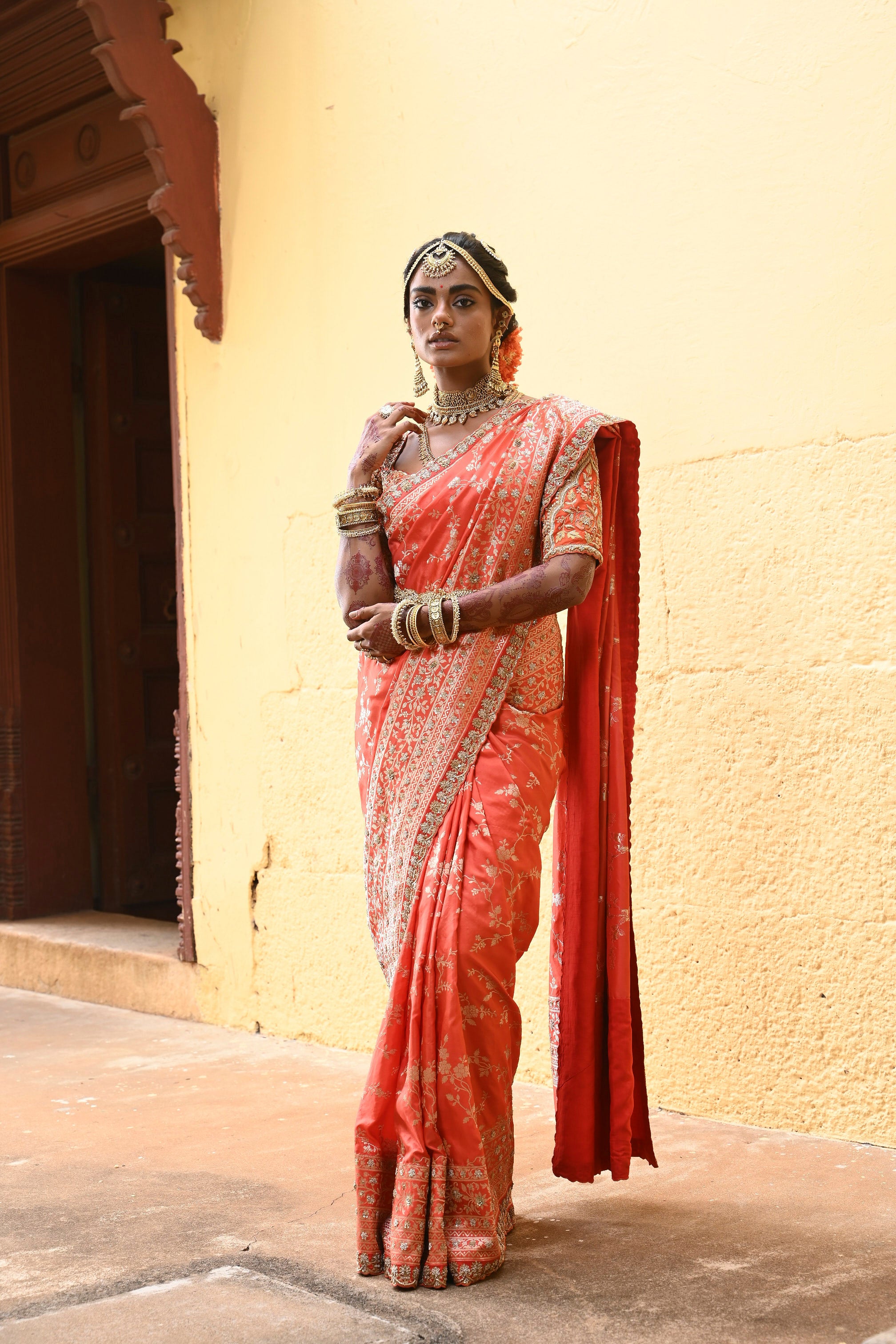 A tangerine Banarasi silk saree in pure Kataan silk in warp and weft with Zardozi Dabka work featuring Jangla, Ektara, Kadhua weave.