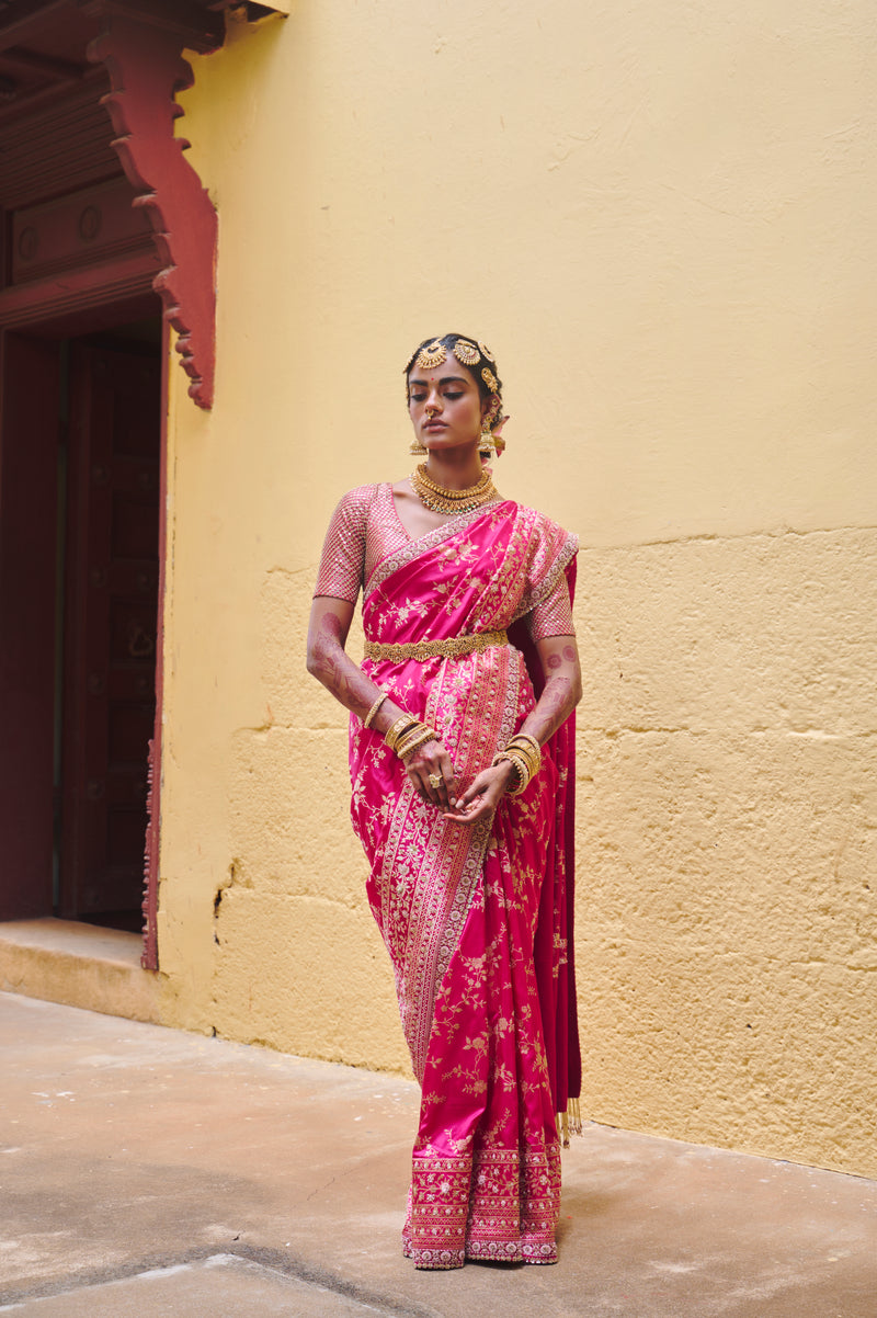 A magenta Banarasi silk saree in pure Kataan silk, highlighted with meticulous Zardozi Dabka embellishment. It features the Jangla, Ektara, and Kadhua weaving styles, bringing together distinct traditional patterns that enhance the visual depth, texture variation, and classic craftsmanship of the Banarasi weaving tradition.